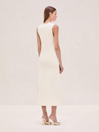 The Obarra Dress is a knit midi dress featuring intricate cut-out sequin detailing along the hem and neckline. Model Measurements Height: 5'11" Bust: 32 Waist: 24" Hips: 34” Model wears XS.