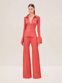 The Olena Top is a ribbed knit button-down with a collared neckline and flared cuffs, paired with the Boda Pant. Model Measurements Height: 5'10" Bust: 34B Waist: 25" Hips: 35” Model wears an XS