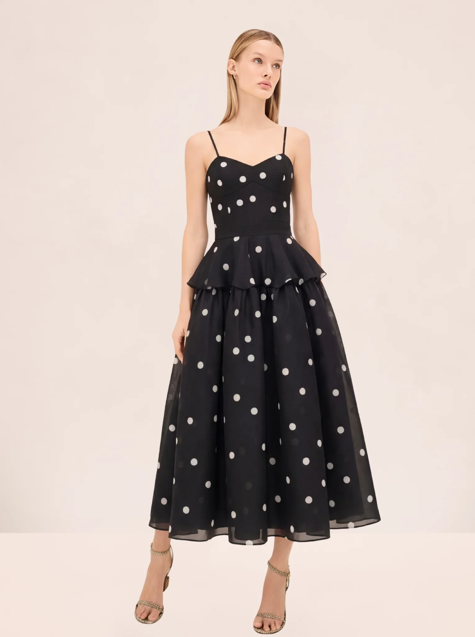 Parma Dress is a sleeveless midi dress with a fitted bodice, polka dot print, and tiered skirt detailing. Model Measurements Height: 5'10" Bust: 34B Waist: 25" Hips: 35” Model wears an XS