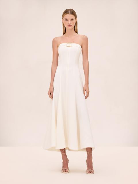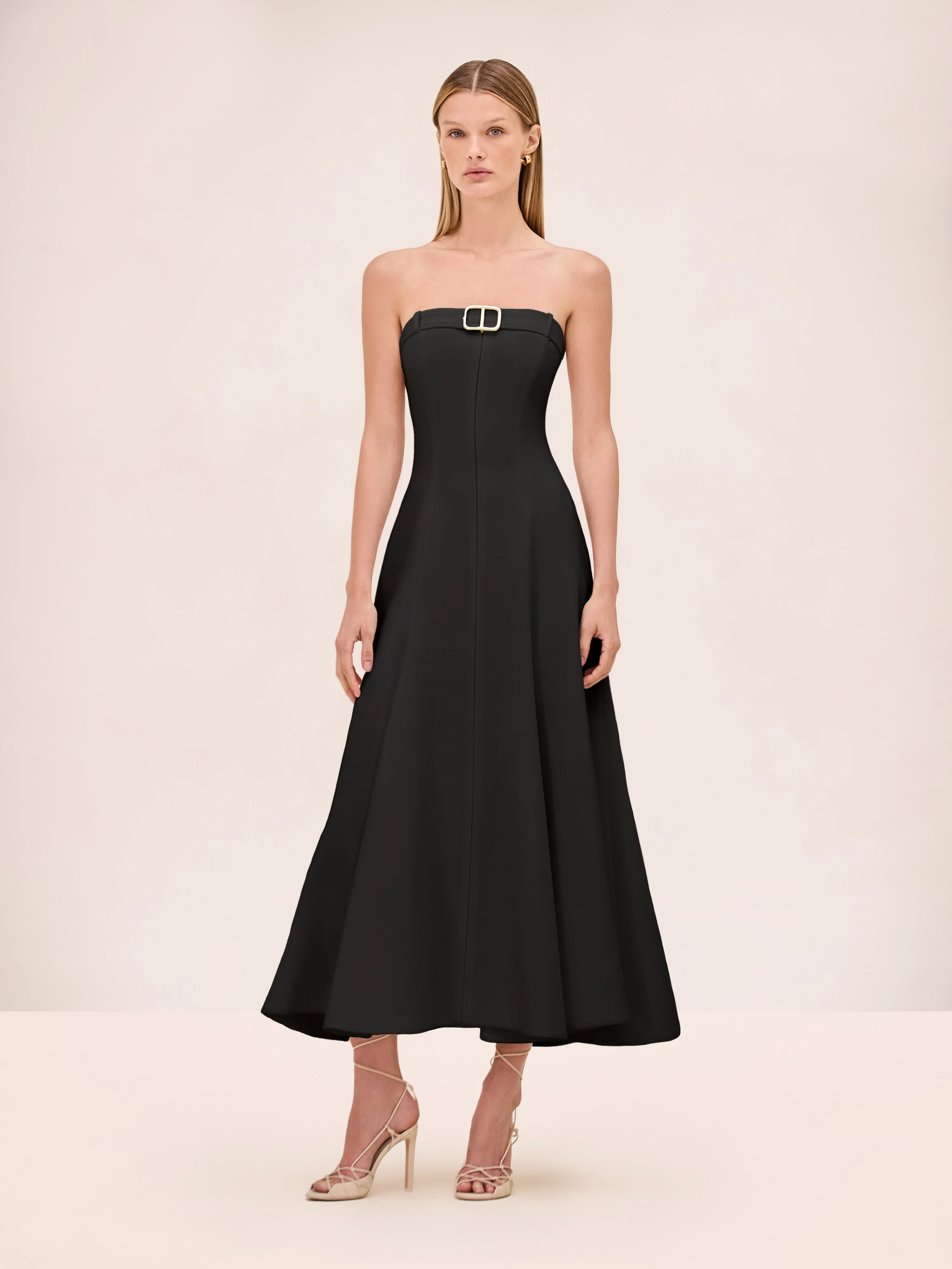 The Pearse Dress is a strapless A-line silhouette featuring a belted neckline detail. Read more Model Measurements Height: 5'10" Bust: 34B Waist: 25" Hips: 35” Model wears an XS Read more