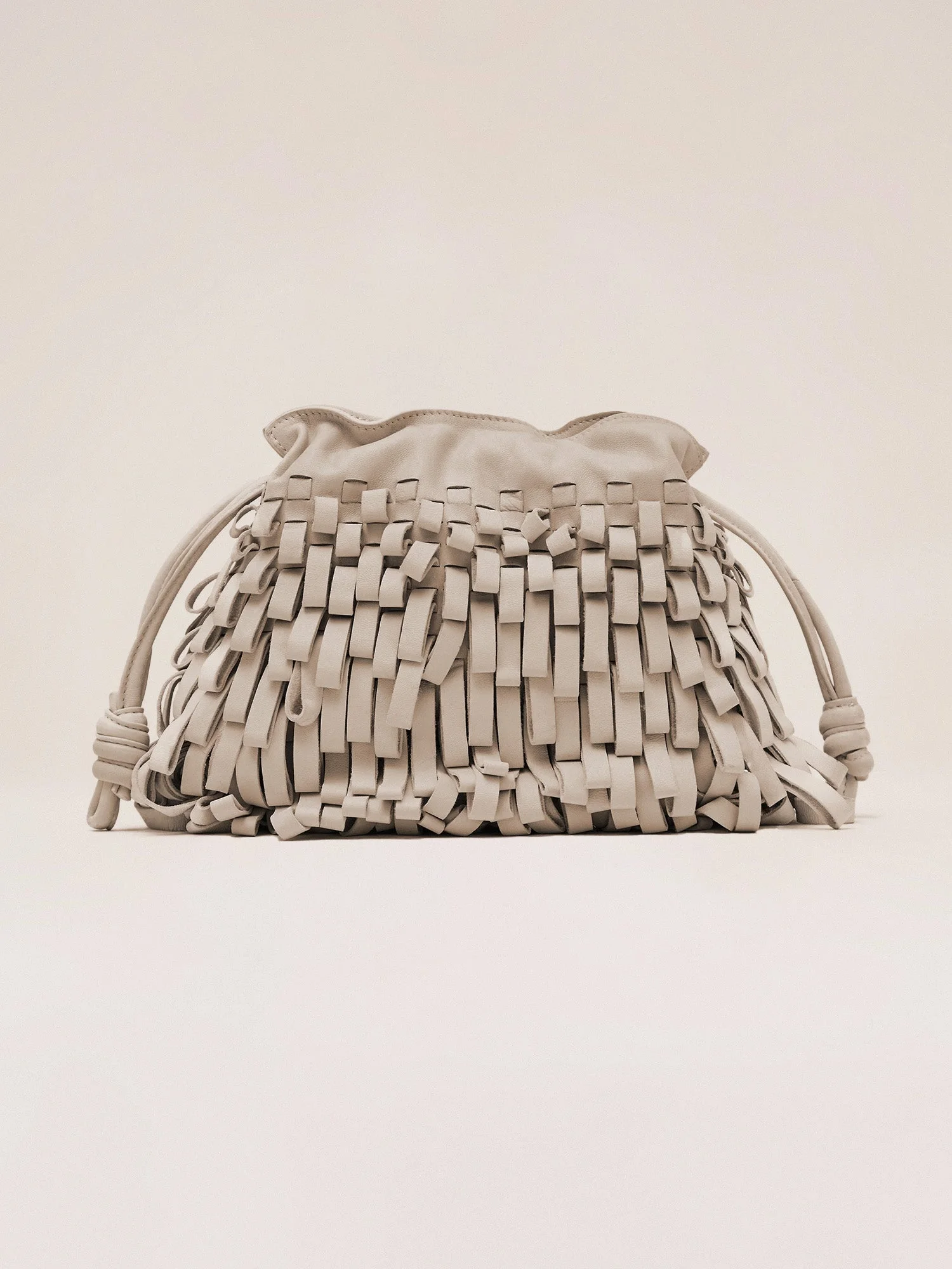 The Quinn clutch features a distinctive hand-woven leather fringe loop design, combining texture and craftsmanship in a compact silhouette. It includes a detachable crossbody strap for versatile styling and is secured with a magnetic and cinch closure. Model Measurements Height: 5'10" Bust: 34B Waist: 25" Hips: 35” Model wears an XS