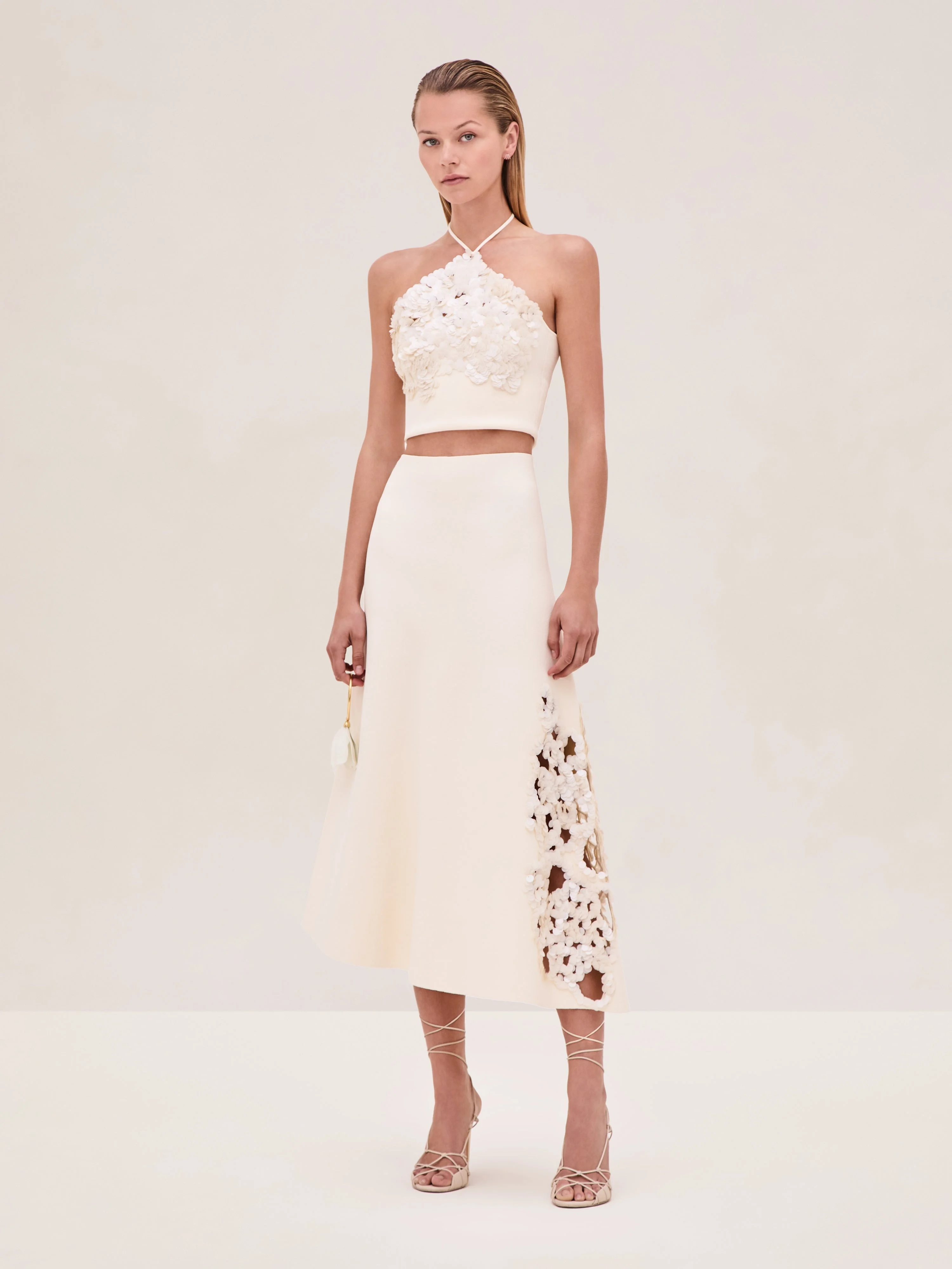 The Relle Top is a knit halter design featuring sequin detailing, paired with the Maris Skirt. Model Measurements Height: 5'10" Bust: 34B Waist: 25" Hips: 35” Model wears an XS