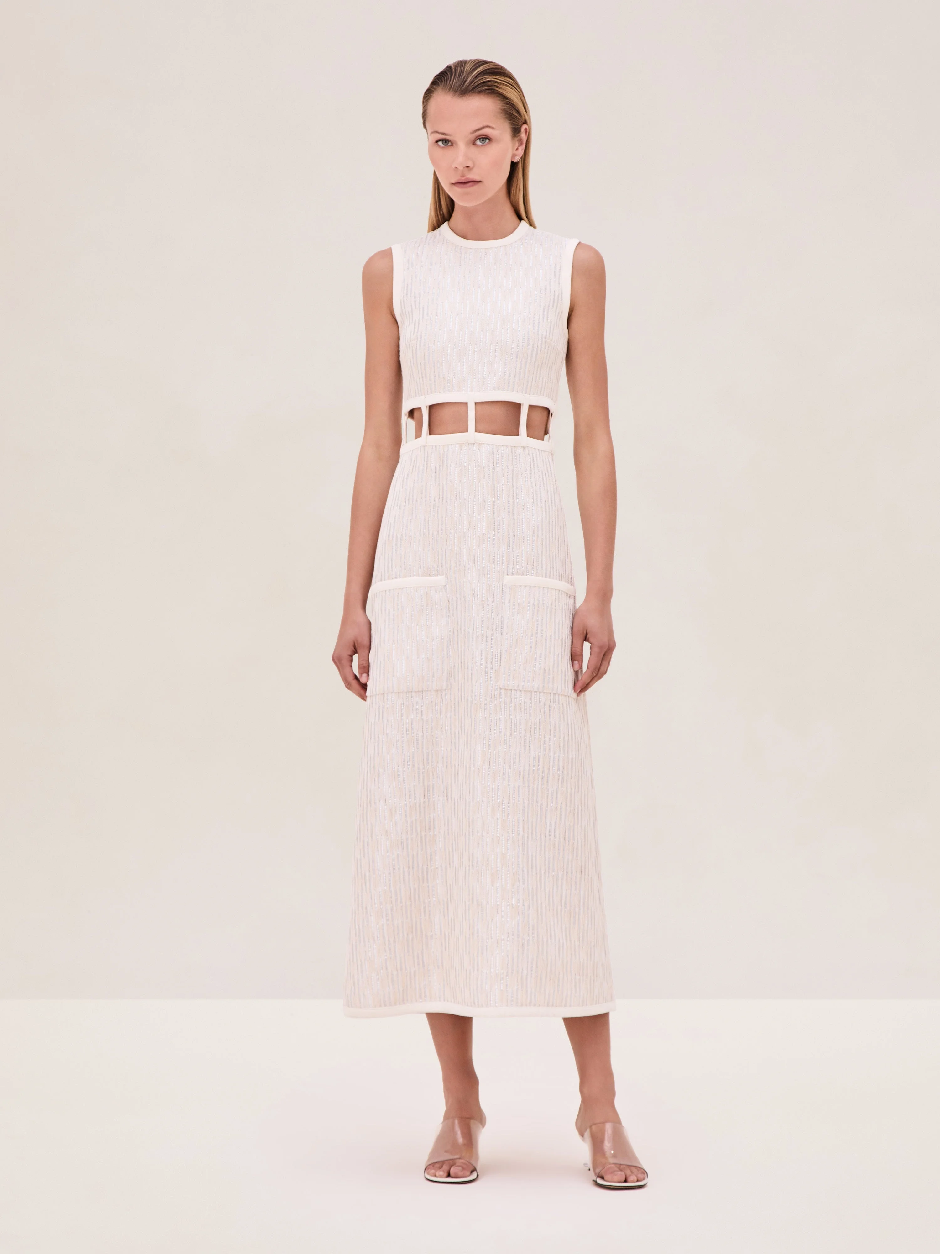 The Renee Dress is a sleeveless, jacquard midi dress with a cut-out detailing at the waist, finished with functional pocket details and subtle shimmer. Model Measurements Height: 5'10" Bust: 34B Waist: 25" Hips: 35” Model wears an XS