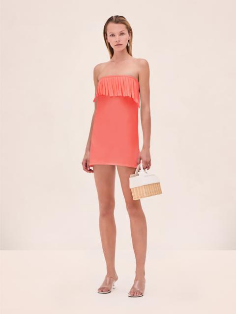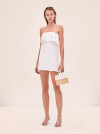 The Rey Dress is a strapless mini designed with a built-in bustino and a cotton fringe neckline. Model Measurements Height: 5'10" Bust: 34B Waist: 25" Hips: 35” Model wears an XS