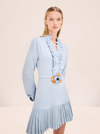 The Romina Dress is a long-sleeve mini dress featuring ruffle trim detailing, a pleated skirt, and a floral waist accent. Model Measurements Height: 5'10" Bust: 34B Waist: 25" Hips: 35” Model wears an XS