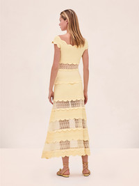 The Saundra Dress is a knit midi design featuring scalloped trim detailing throughout. Model Measurements Height: 5'10" Bust: 34B Waist: 25" Hips: 35” Model wears an XS