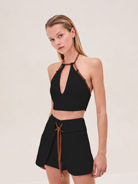 The Saya Top is a twill halter crop top featuring a keyhole neckline and accentuated with a suede frame loop detailing, paired with the Prato Skort. Model Measurements Height: 5'10" Bust: 34B Waist: 25" Hips: 35” Model wears an XS