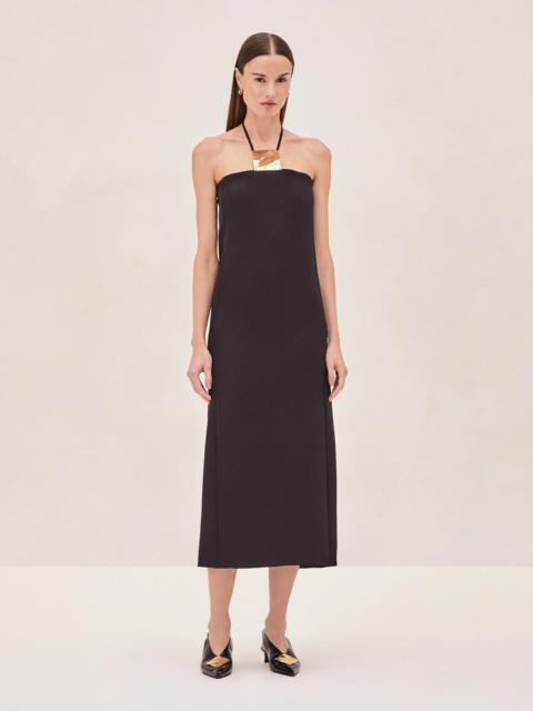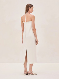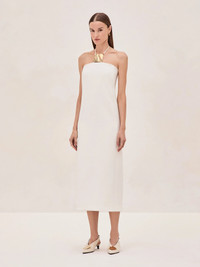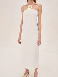 Introducing the Sezane Midi Dress—a modern piece with a sleek halter neckline, accentuated by a distinctive gold square detail. This midi dress features a streamlined silhouette that falls elegantly, offering a clean and contemporary look. Perfect for both day and evening, the Sezane Midi Dress is versatile in its simplicity, allowing for easy styling whether dressed up with heels or kept minimal. A true go-to for a polished and effortless appearance. Model Measurements Height: 5'10" Bust: 34B Waist: 25" Hips: 35”