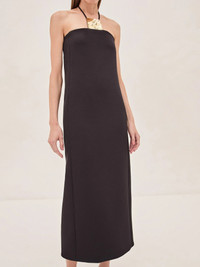 Introducing the Sezane Midi Dress—a modern piece with a sleek halter neckline, accentuated by a distinctive gold square detail. This midi dress features a streamlined silhouette that falls elegantly, offering a clean and contemporary look. Perfect for both day and evening, the Sezane Midi Dress is versatile in its simplicity, allowing for easy styling whether dressed up with heels or kept minimal. A true go-to for a polished and effortless appearance. Model Measurements Height: 5'10" Bust: 34B Waist: 25" Hips: 35”