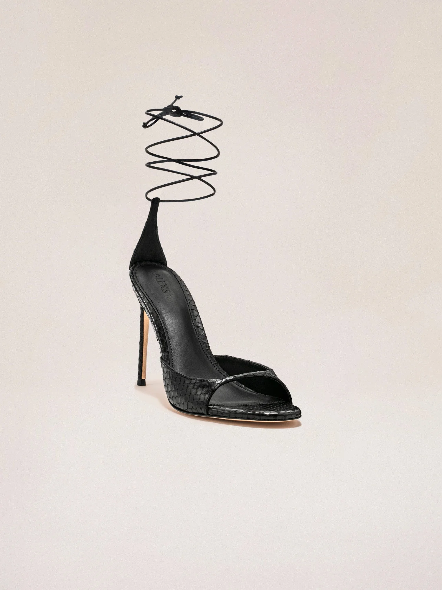 The Sienna Heel is an open-toe stiletto with a textured upper and slim straps that wrap around the ankle. Its clean, modern design is both elegant and refined. Model Measurements Height: 5'10" Bust: 34B Waist: 25" Hips: 35” Model wears an XS