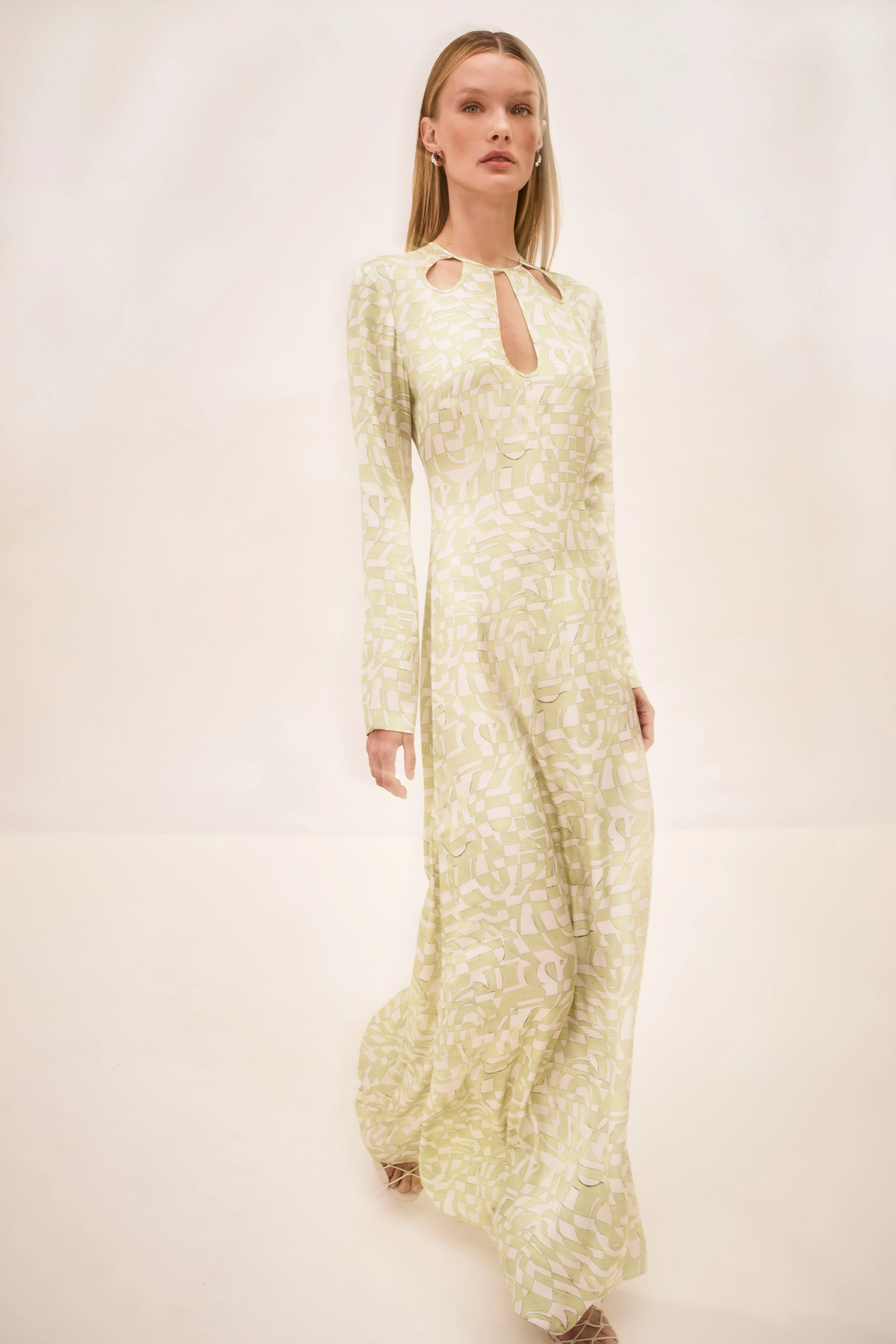 The Skyla Dress is a long sleeve column silhouette featuring keyhole cutouts and an abstract print. Model Measurements Height: 5'10" Bust: 34B Waist: 25" Hips: 35” Model wears an XS