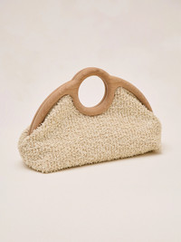 The Sloane clutch features a striking silhouette with a hand-milled Italian beechwood handle, showcasing exceptional craftsmanship. It is designed with a magnetic closure for easy functionality. Model Measurements Height: 5'10" Bust: 34B Waist: 25" Hips: 35” Model wears an XS