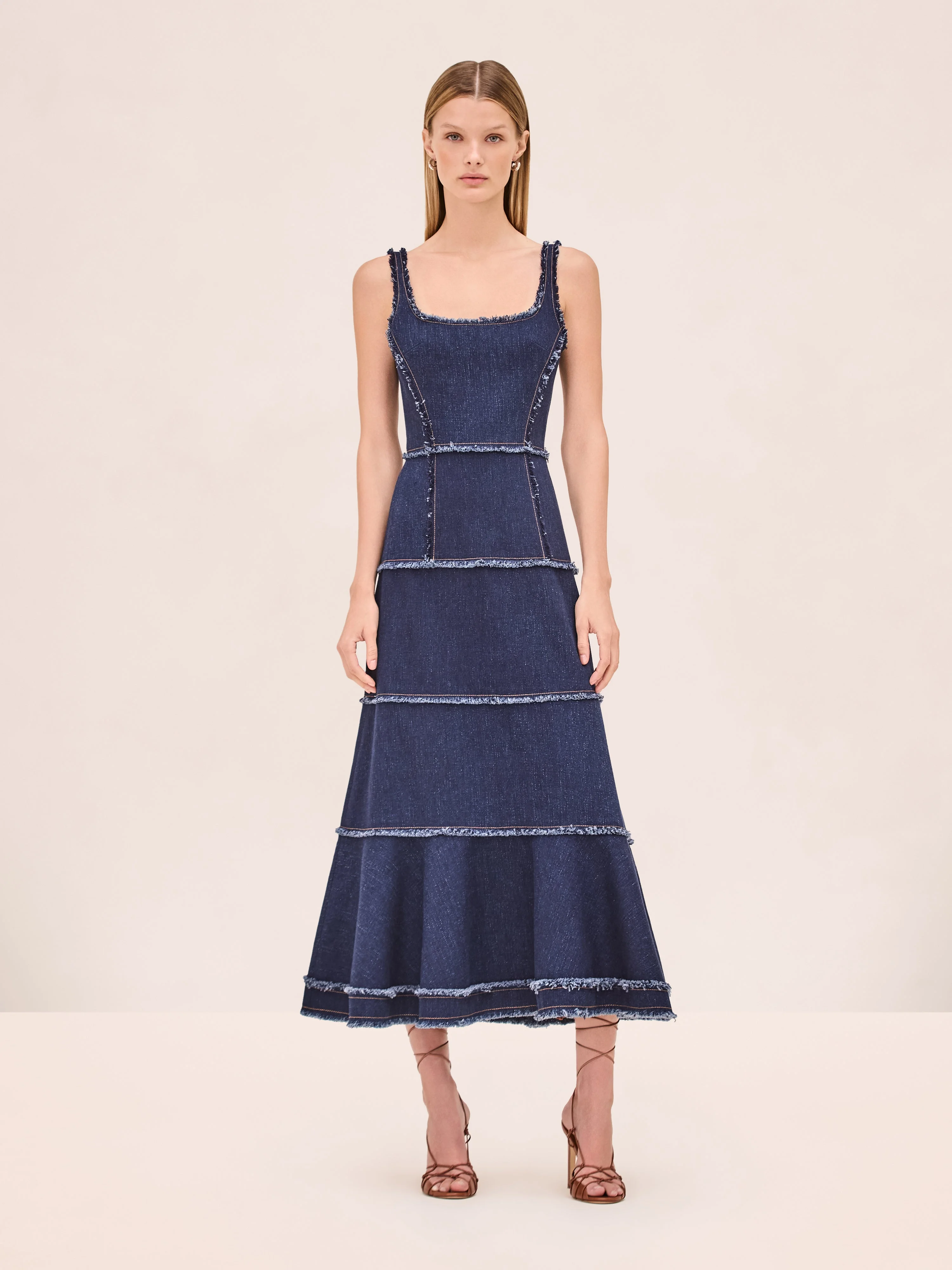 The Stefania Dress is a strapless silhouette featuring tiered fringe detailing and a full-length hem. Model Measurements Height: 5'10" Bust: 34B Waist: 25" Hips: 35” Model wears an XS