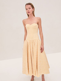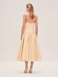The Summers Dress is a herringbone textured strapless midi dress with a drop-waist and pleated skirt. Model Measurements Height: 5'11" Bust: 32 Waist: 24" Hips: 34” Model wears XS.