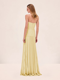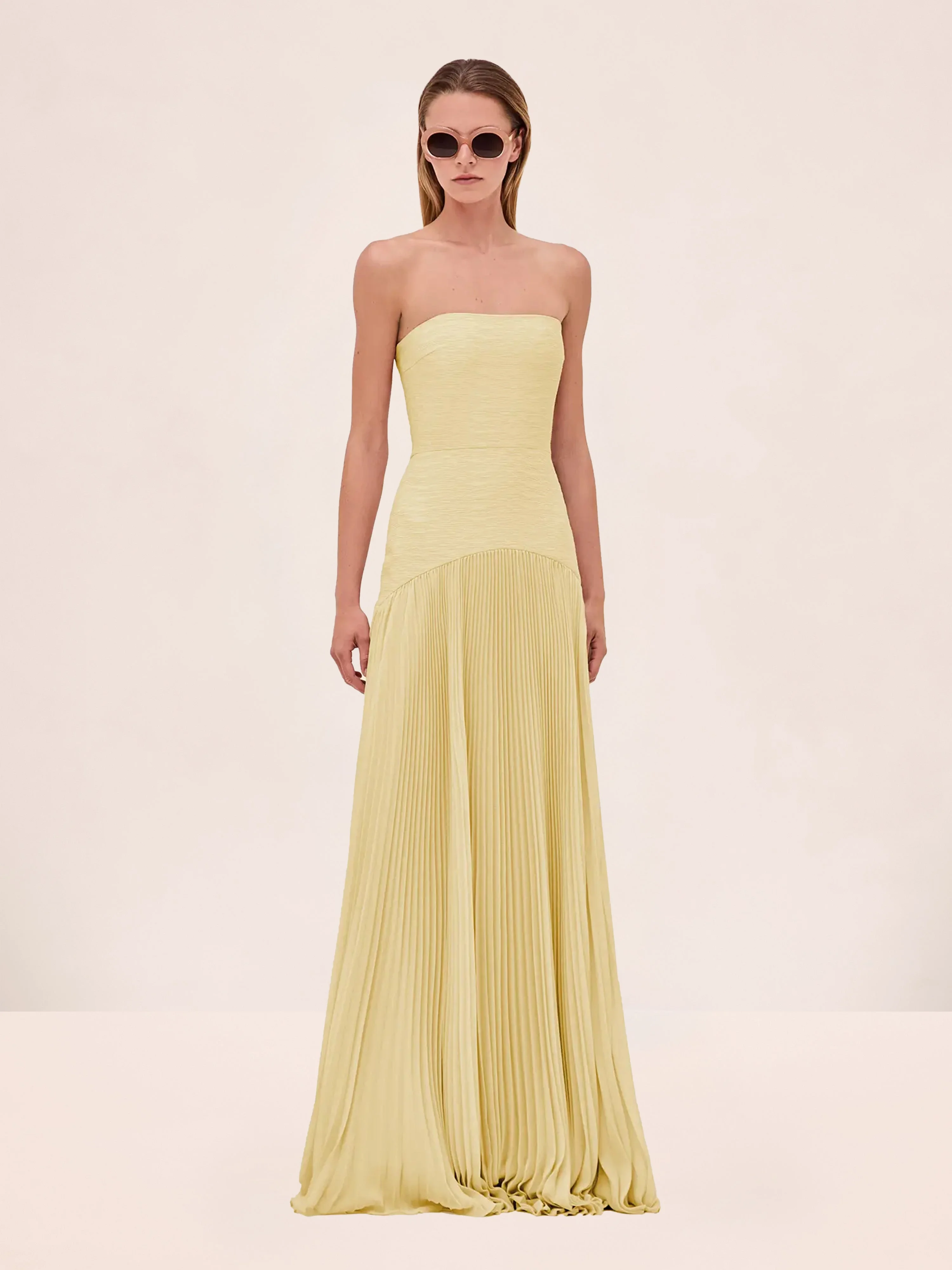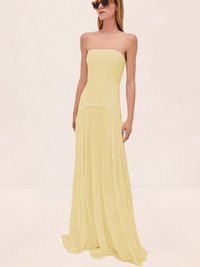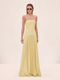 The Sunniva Dress is strapless gown with a fitted bodice and a floor-length pleated skirt. Model Measurements Height: 5'10" Bust: 34B Waist: 25" Hips: 35” Model wears an XS