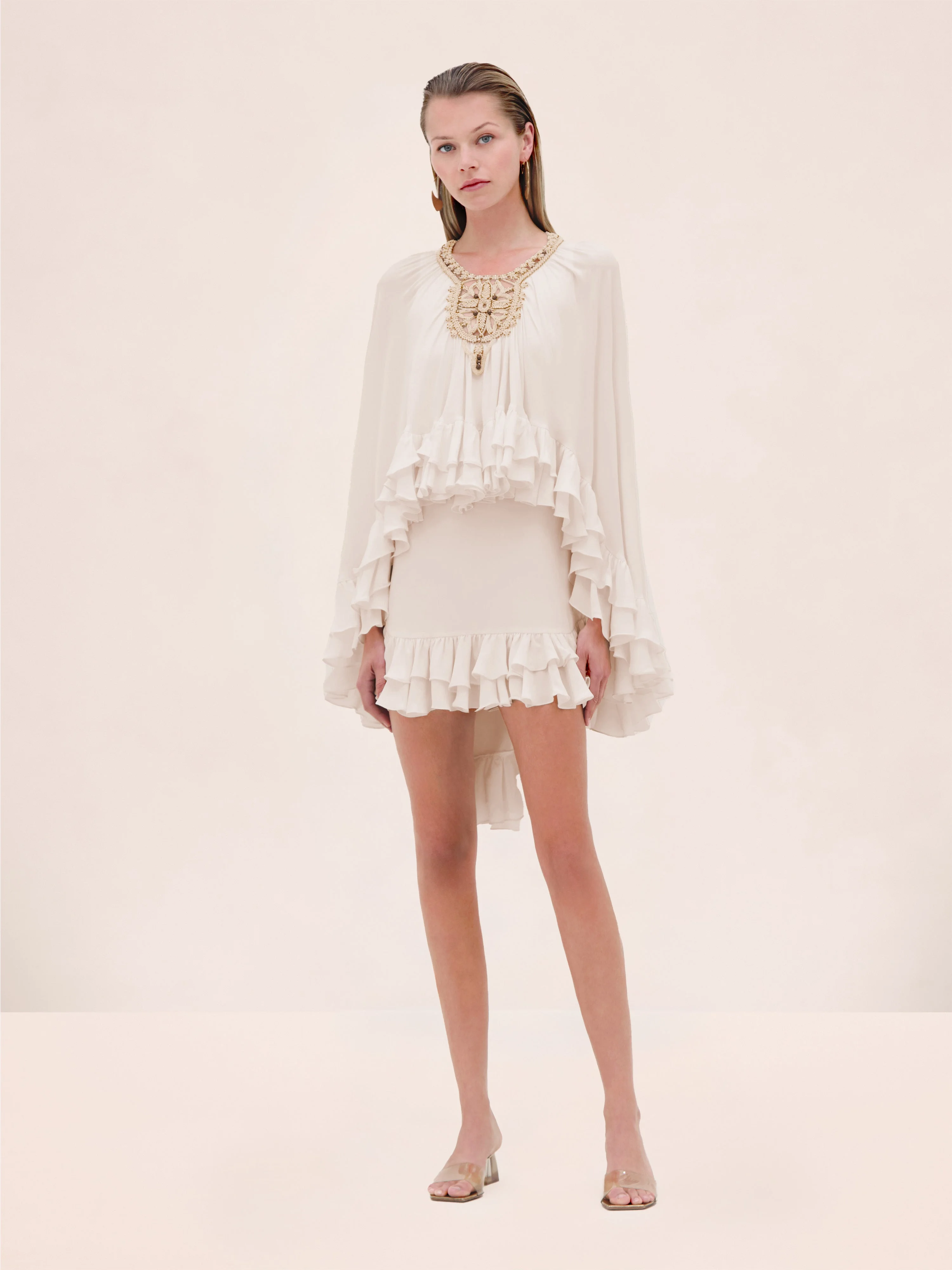 The Taessa Dress is a fluid crepe mini dress with a soft drape and ruffled hem, finished with a hand-beaded necklace at the neckline. Model Measurements Height: 5'10" Bust: 34B Waist: 25" Hips: 35” Model wears an XS