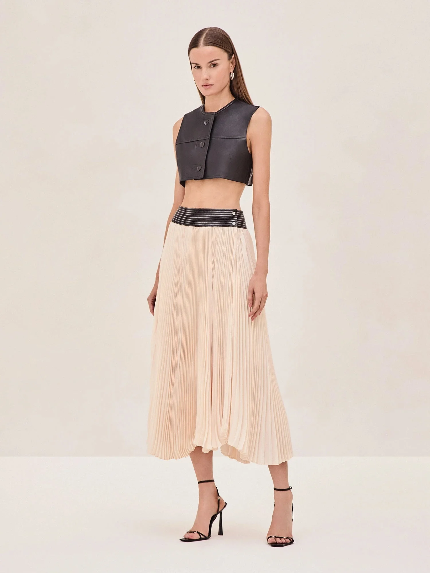 Introducing the Tansia Skirt, your new statement piece. This skirt is all about making an impact with its high slit and flowy pleats that move beautifully with every step. The wide waistband adds a touch of structure, while the soft, ethereal fabric brings an air of effortless elegance. Pair it with a the Revel top for a bold, edgy look or keep it casual with the Hayes Cardigan. We recommend sizing down if you want it to fit at the waist as it sits at the low hip by design. Model Measurements Height: 5'10" Bust: 34B Waist: 25" Hips: 35” Model wears an XS