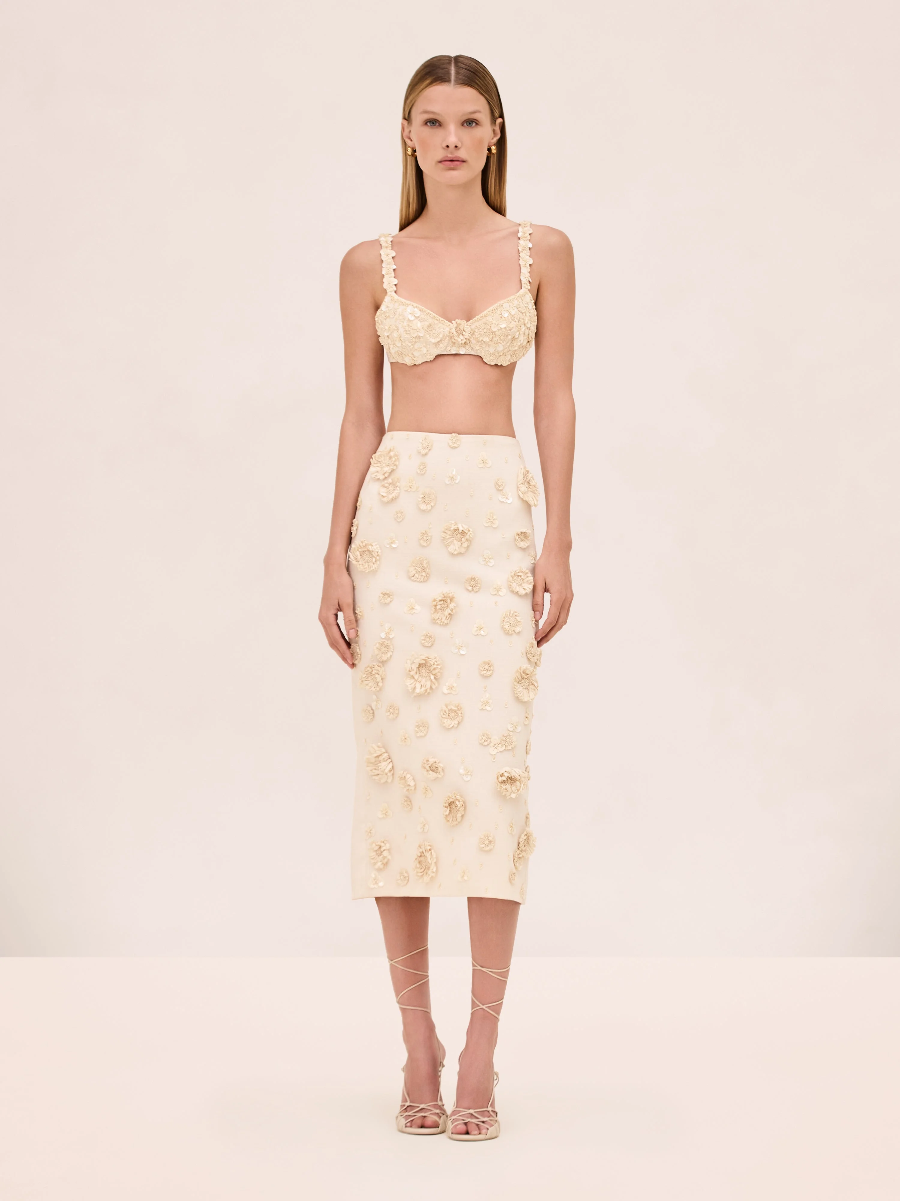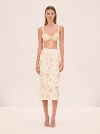 The Torie Skirt is a midi silhouette featuring floral applique detailing, paired with the Remi Top. Read more Model Measurements Height: 5'10" Bust: 34B Waist: 25" Hips: 35” Model wears an XS Read more