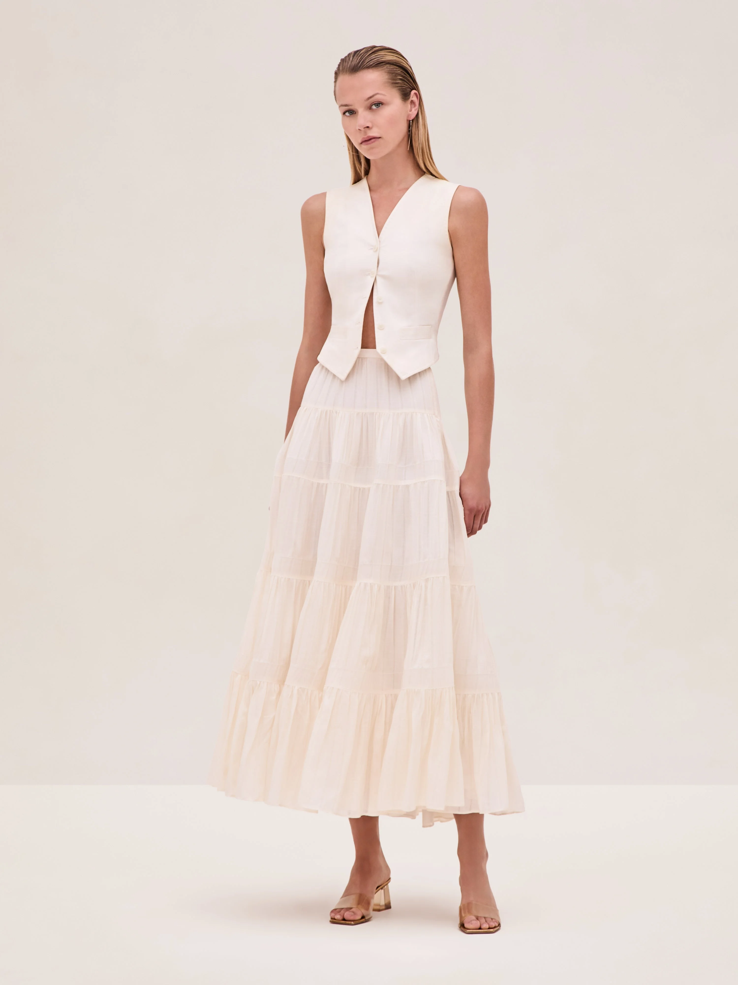 The Torre Vest is button-front top, paired with the Liotta Skirt. Model Measurements Height: 5'10" Bust: 34B Waist: 25" Hips: 35” Model wears an XS