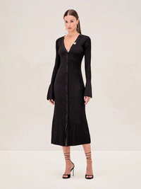 The Trisha Dress is a ribbed knit midi dress with a deep V-neckline, flared cuffs, and a button-front closure. Model Measurements Height: 5'10" Bust: 34B Waist: 25" Hips: 35” Model wears an XS