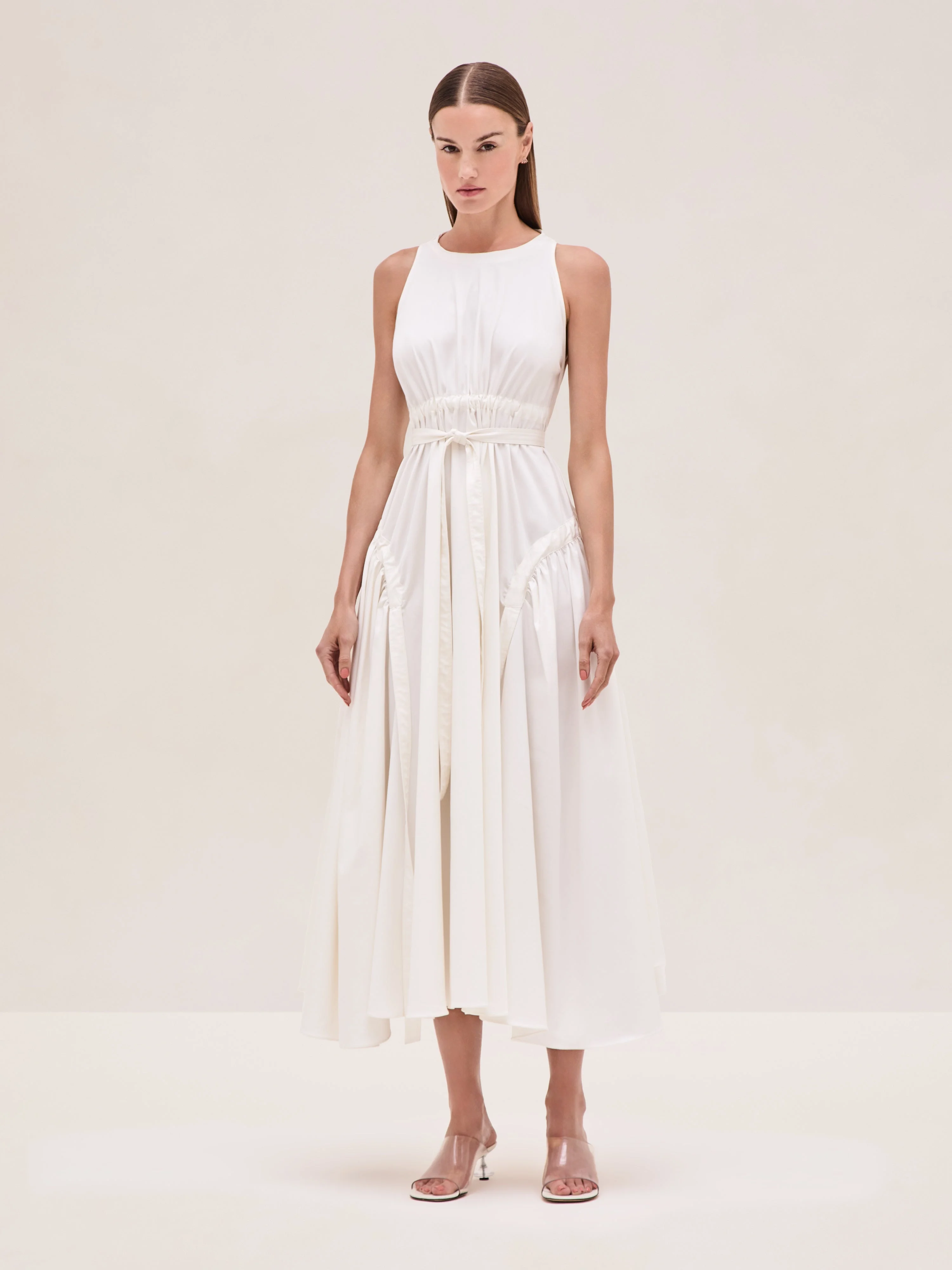 The Versaille Dress is a cotton poplin midi design featuring adjustable tiered detailing. Model Measurements Height: 5'10" Bust: 34B Waist: 25" Hips: 35” Model wears an XS