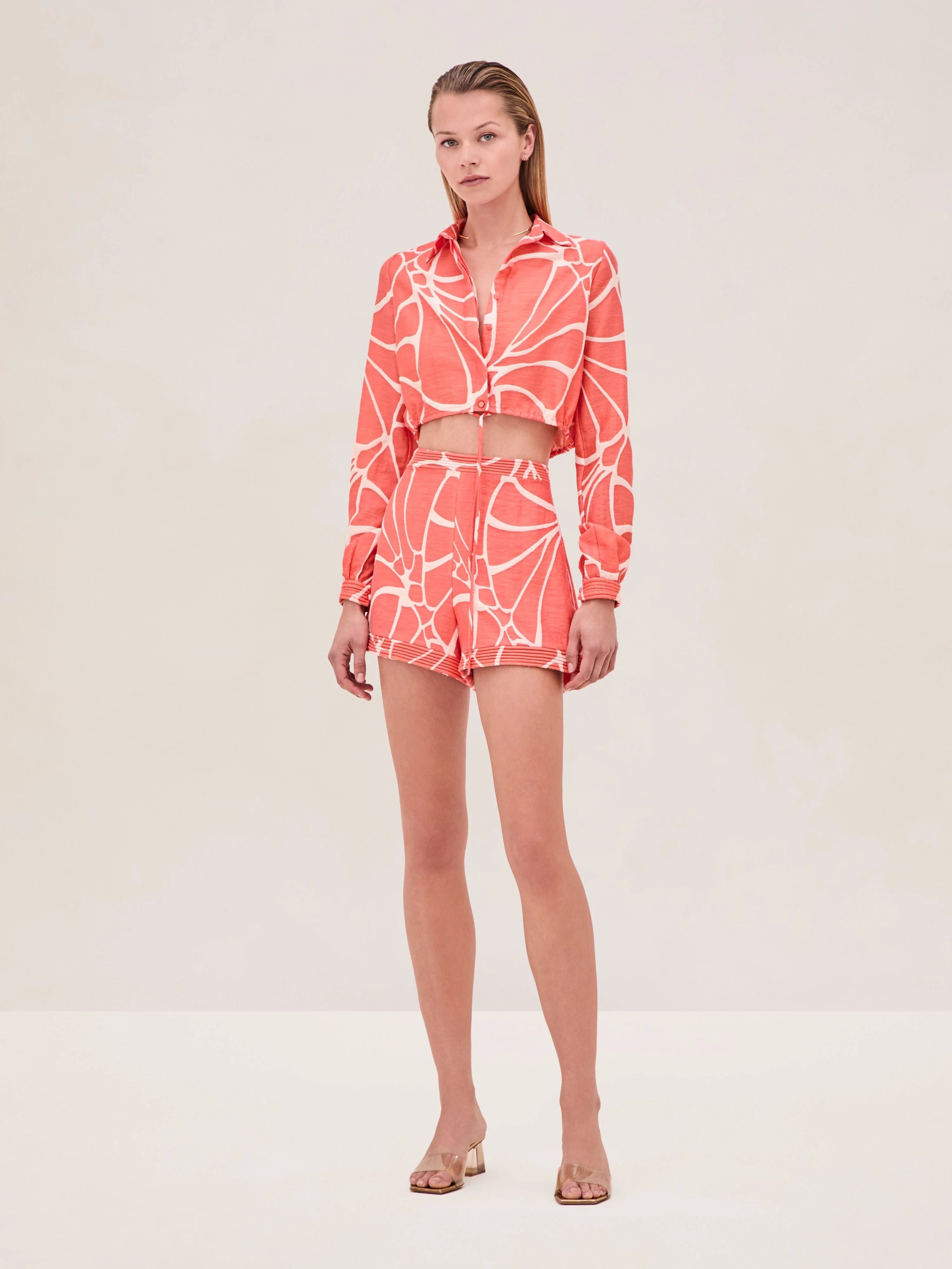 The Yael Top is a textured jacquard top featuring a collar, corded piping long sleeves, and an adjustable drawstring hem, paired with the Izmir Short. Model Measurements Height: 5'10" Bust: 34B Waist: 25" Hips: 35” Model wears an XS