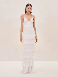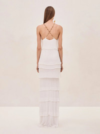 Introducing the Yira Dress - a stunning display of cascading elegance. This floor-length gown features pleated tiers that form a striking and refined silhouette. With a deep V-neckline and delicate gold chain straps, it exudes allure, while its flowing design offers graceful movement with each step. Whether for a lavish affair or intimate gathering, the Yira Dress provides timeless sophistication with a touch of contemporary glamour. Model Measurements Height: 5'10" Bust: 34B Waist: 25" Hips: 35”
