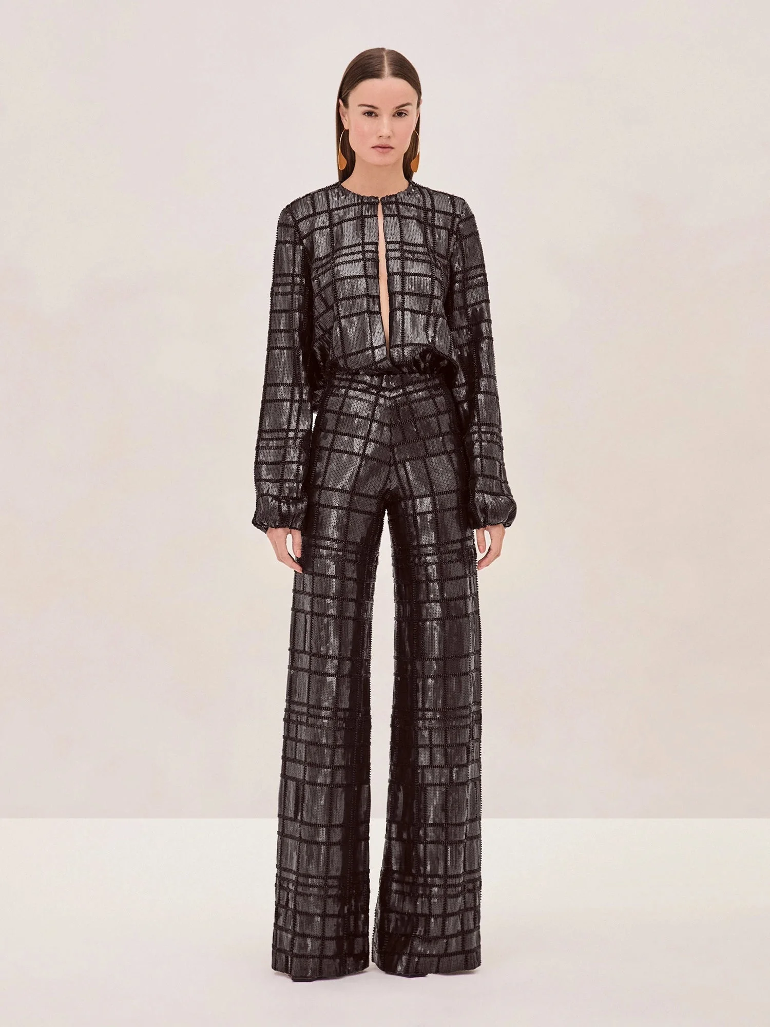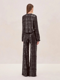 Introducing the Zano Pant—a sleek and striking piece that brings an elevated edge to evening dressing. These high-waisted pants feature a flattering, tailored fit that flows into a subtle flare, creating a lengthening silhouette. Covered in shimmering sequins, the Zano Pant adds a touch of bold sophistication to any outfit. Designed to pair perfectly with the Reis Sequin Top. Model Measurements Height: 5'10" Bust: 34B Waist: 25" Hips: 35”