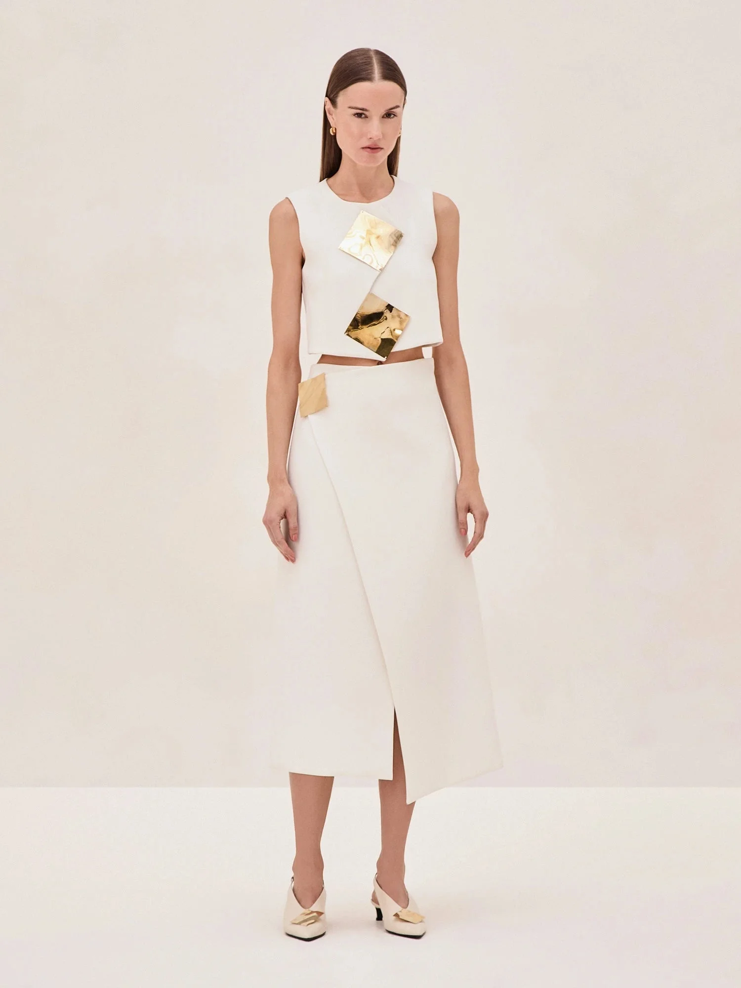 The Zilai Skirt boasts a sharp, tailored design with a high waist, lending a classic yet modern aesthetic. Adorned with a striking metallic geometric embellishment, the Zilai Skirt exudes a contemporary edge that perfectly complements its minimalist style. Coordinate it with the Athens Top for a cohesive look. Model Measurements Height: 5'10" Bust: 34B Waist: 25" Hips: 35” Model wears an XS