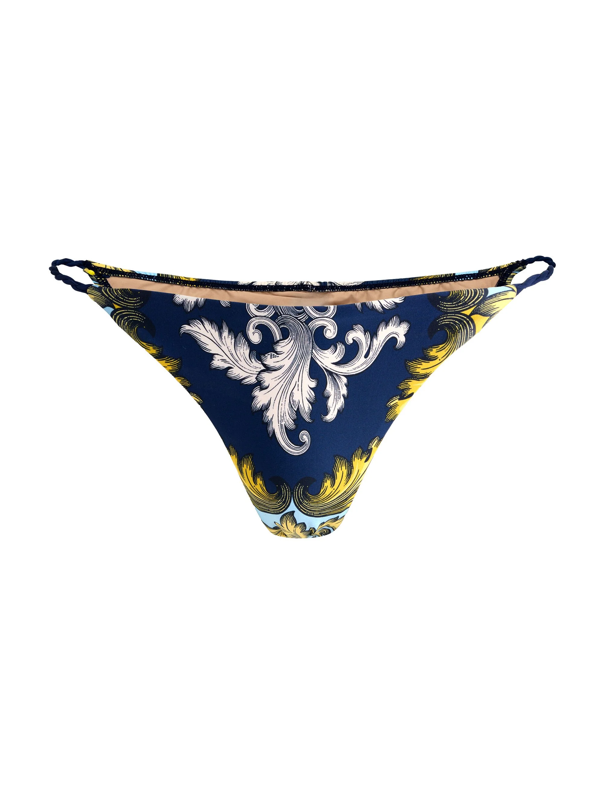 ALICE + OLIVIA x PQ Swim fuses playful prints, feminine silhouettes, and the spirit of endless summer. A celebration of confidence and color, this collection was designed for sun-drenched days and unforgettable escapes. Pop from pool to party in this teeny bikini bottom, decked out in our antique scroll motif and tied together with baroque-twisted rope. Complete the moment with the matching top and Lane Slit Cuff Oversized Button Down (we like to wear it a little wrinkled and totally open). DETAILS - Bikini bottom - Twisted rope sides - Low back logo made from tarnish-free 24k gold - 81% polyester, 14% elastane, 5% recycled polyamide - Hand wash cold; hang to dry - Imported FIT - Teeny coverage - Lifting ruched back - Model is 5'10" and wearing a size XS - Fits true to size, take your normal size