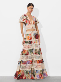 A floral moment that feels pulled from another era. The Adira maxi skirt is designed in tiered cotton voile, finished with delicate lace embroidery and a decorative button front detail. Its vintage-inspired print and sweeping silhouette bring femininity, while a side zip keeps the fit clean. Fully lined and endlessly romantic, it pairs perfectly with its matching Keeley flutter blouse-or anything that deserves a dreamy backdrop. DETAILS - Maxi skirt - Tiered - Digitally printed floral cotton voile - Embroidered lace panels - Pintuck detailing - Side zipper closure - Lined - 100% cotton - Dry clean only - Imported FIT - Model is 5'10" and wearing a size 0 - Skirt length: 39" - Fits true to size, take your normal size