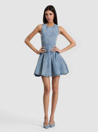 The same silhouette you know and love, now in a denim construction perfect for warmer seasons. With its sculptural, couture shape, this drop waist mini dress is the perfect summer throw-on-and-go piece. It has a fitted bodice that opens up to a gorgeous A-line skirt, while gentle pleats give it girly volumes and an adorable flare. A truly special dress that is guaranteed to turn heads. DETAILS - Denim mini dress - Drop waist - Fit and flare - Pleated skirt - Back zipper closure - 94% cotton, 5% elastomultiester, 1% elastane - Dry clean only - Imported FIT - Model is 5'10" and wearing a size 0 - Length from the shoulder: 33" - Fits true to size, take your normal size