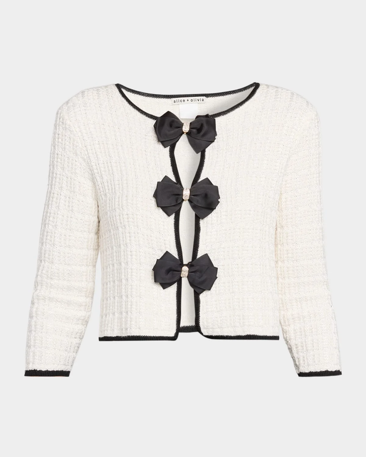 - Adorned with three rhinestone-embellished satin bows, the "Akira" cardigan by Alice + Olivia is crafted from a textured knit with contrasting trim - Approx. 18.8"L from shoulder to hem - Scoop neckline - 3/4 sleeves - Classic fit - Hip length - Front hook closures - Viscose/cotton - Dry clean - Imported