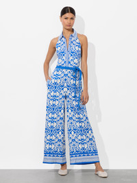 Tailored meets unexpected in this effortlessly striking halter wide-leg jumpsuit. The front delivers polish with a crisp collar and button-down placket, while the halter neckline and open back add an element of surprise. Crafted from breathable printed linen and finished with an adjustable braided tie waist and side pockets, it’s a one-and-done piece that feels both put-together and playful. Just add sandals and let the jumpsuit do the styling for you. DETAILS - Wide leg jumpsuit - Collared halter neck - Ankle length - Printed linen - Side pockets - Adjustable braided tie waist - Button front with hidden placket - Smocked back with zipper closure - 56% linen, 43% viscose, 1% elastane - Dry clean only - Imported FIT - Model is 5'10" and wearing a size 0 - Length from the shoulder: 56" - Inseam: 27 1/4" - Fits true to size, take your normal size
