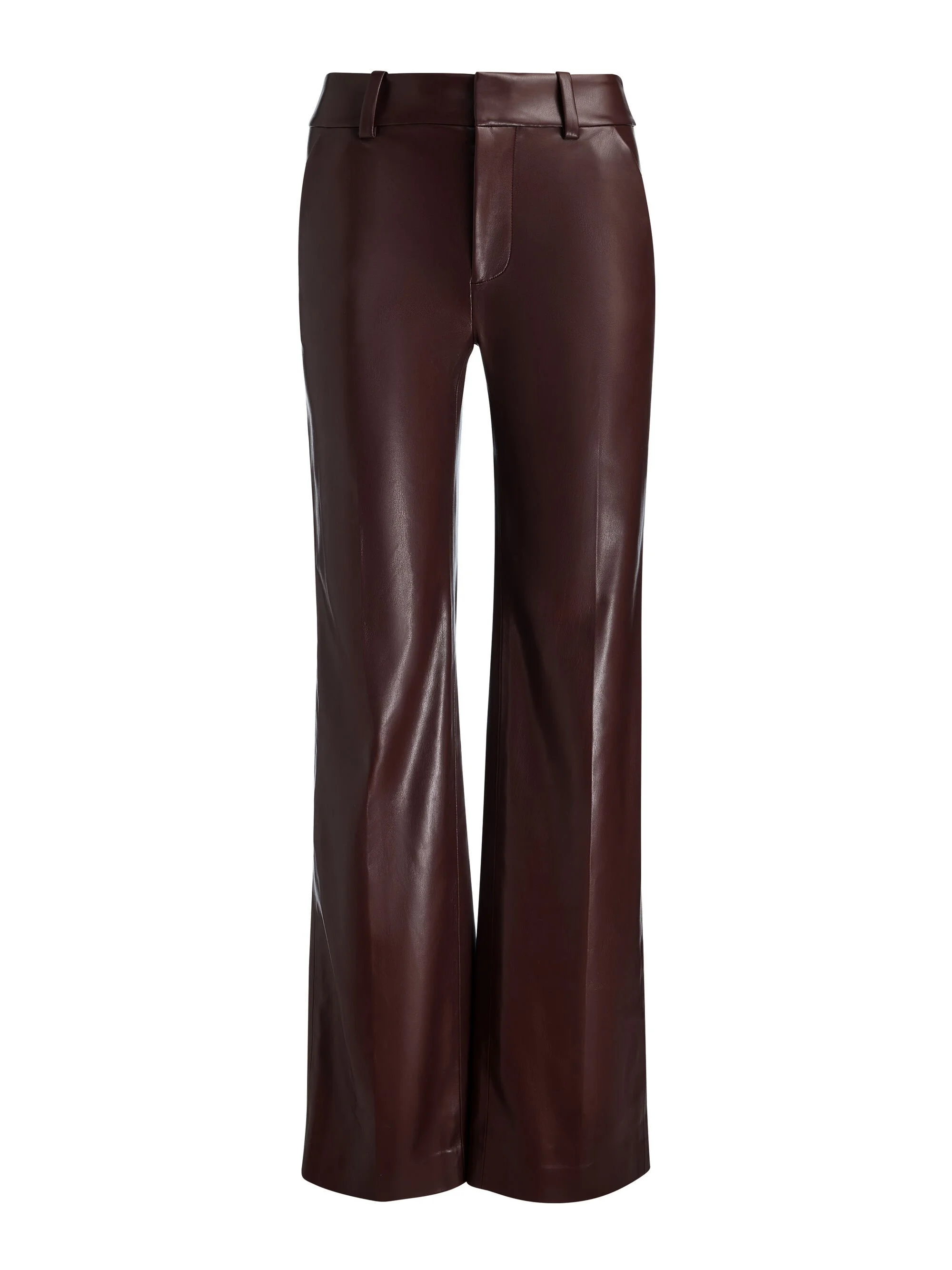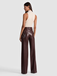 A modern take on classic tailoring. The Alexander is cut from supple vegan leather with a high rise and wide leg for a polished, elongated silhouette. Finished with a clean front, hidden closure, and slim straight fit that moves with you. They mean business - but they also know how to have a good time. Pair with a blazer, or don’t. These brown vegan leather pants turn heads either way. DETAILS - Faux leather trouser - Slim straight fit - High rise - Wide leg - Belt loops - Hidden front hook and zipper closure - 100% polyurethane - Dry clean only - Imported FIT - Model is 5'10" and wearing a size 0 - Front rise: 11" - Inseam: 34 1/2" - Fits true to size, take your normal size
