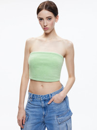 We're reviving our love of crop tops and this cropped sweater version fits the bill. It also fits like a dream, you'll see. DETAILS - Tube top - Cropped - Strapless - Terry cloth - Tota length: 16” - 100% nylon - Fits true to size, take your normal size - Aqua is wearing a size Small and her measurements are 5’10”, 32” bust, 23” waist, 34” hips - Dry clean only - Imported