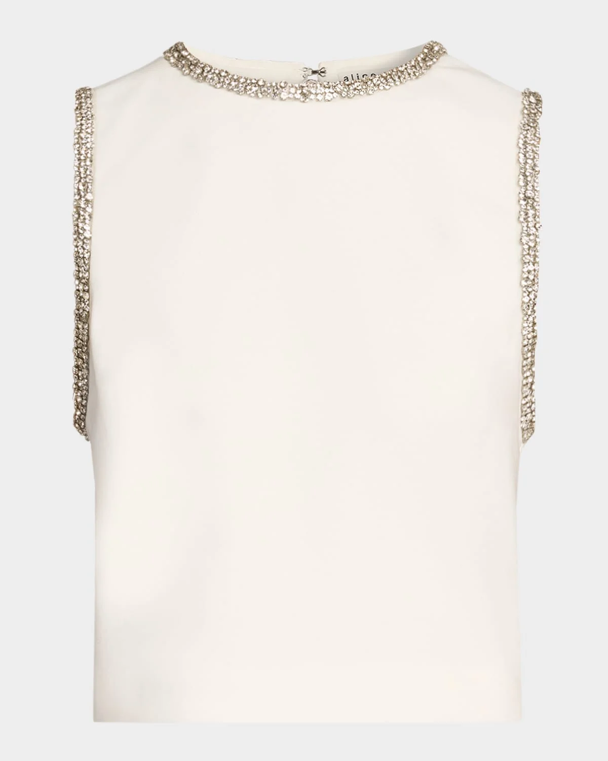 Crafted from recycled matte satin crepe, the "Amal" top by Alice + Olivia is outlined with crystalembellished trim Approx. 19"L from shoulder to hem Crew neckline Sleeveless Relaxed fit Hip length Center back zipper Recycled polyester/polyester/elastane Dry clean Imported