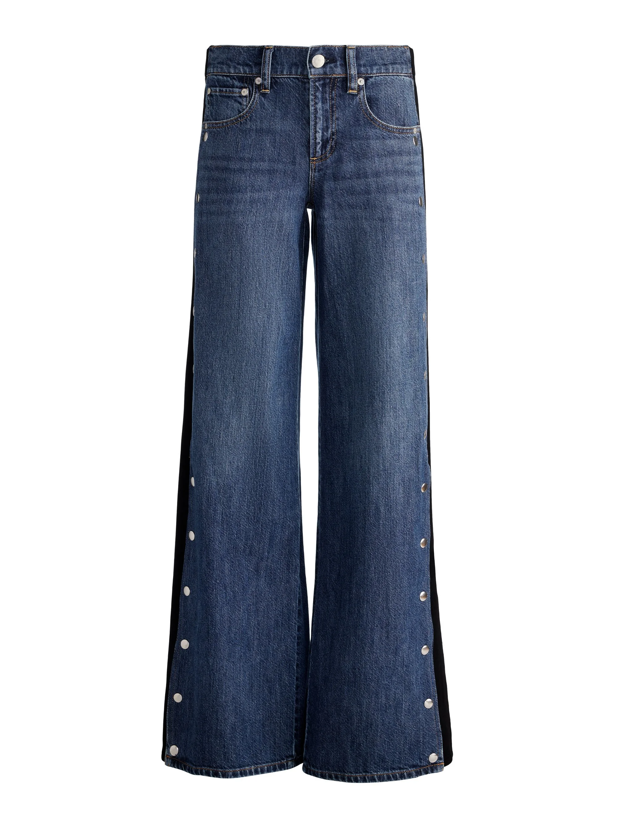 Introducing: The Amazing Jean. Low rise. Wide leg. Effortless everyday ease with an added flair. The Amazing Jean perfects the baggy silhouette with 100% cotton that drapes just right and feels better with every wear. Leg-lengthening knit panels down the side give you instant supermodel legs, while the snap closures add an optional split hem. Wear it slouchy, style it sleek-either way, you'll look AMAZING. DETAILS - Baggy jean - Low rise - Wide leg - Mixed media side panels with snap closures - Belt loops - Front button and zipper closure - Shell: 100% cotton - Combo: 75% viscose, 25% elastane - Dry clean only - Imported FIT - Model is 5'10" and wearing a size 24 - Front rise: 9 1/8" - Inseam: 34 1/2" - Fits true to size, take your normal size