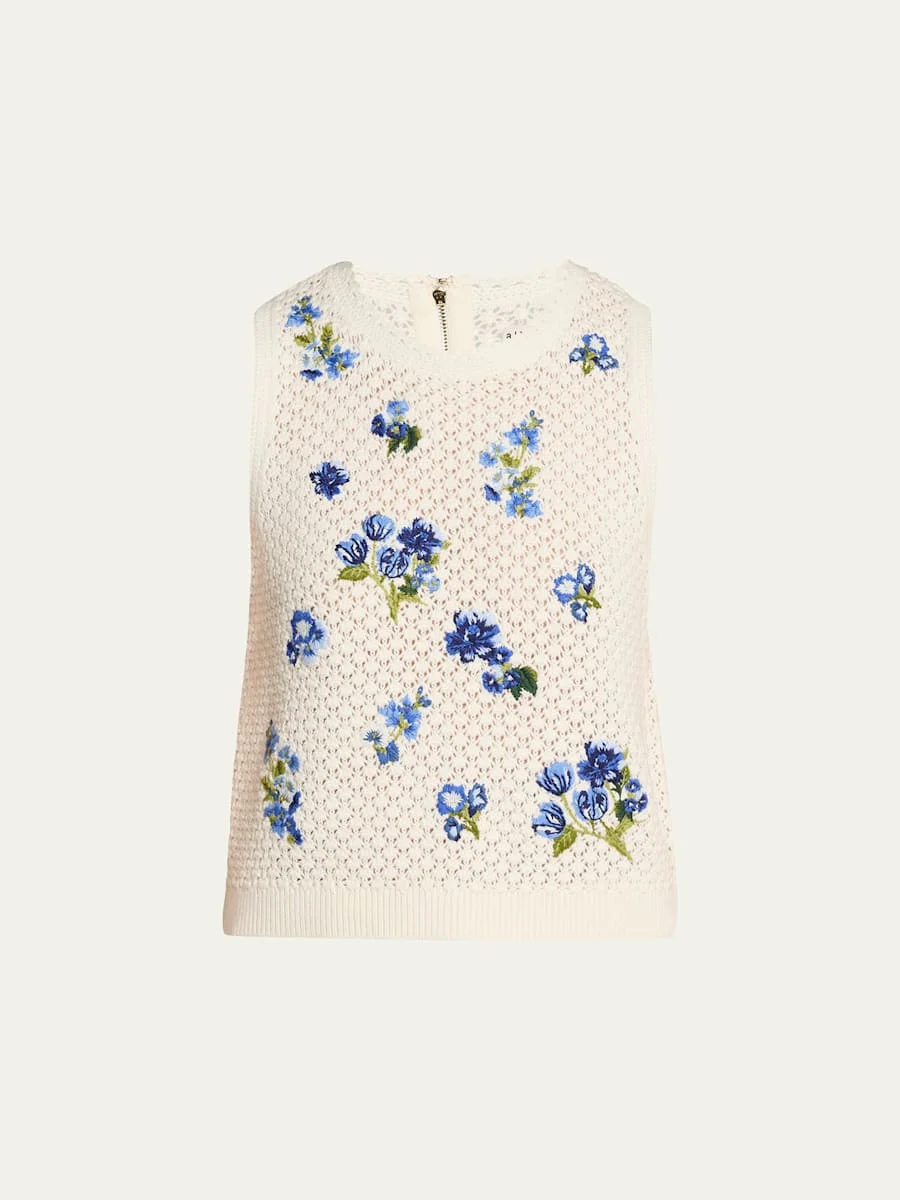 ALICE + OLIVIA's "Amity" tank top is knit with textured crochet detailing and embroidered with contrasting floral embroidery Approx. 19"L from shoulder to hem Crew neckline Sleeveless Slim fit Hip length Center back zipper Wool/cotton/elastane Dry clean Imported SIZE amp; FITModel measurements: 5'10" tall Model is wearing a US size 4/Small