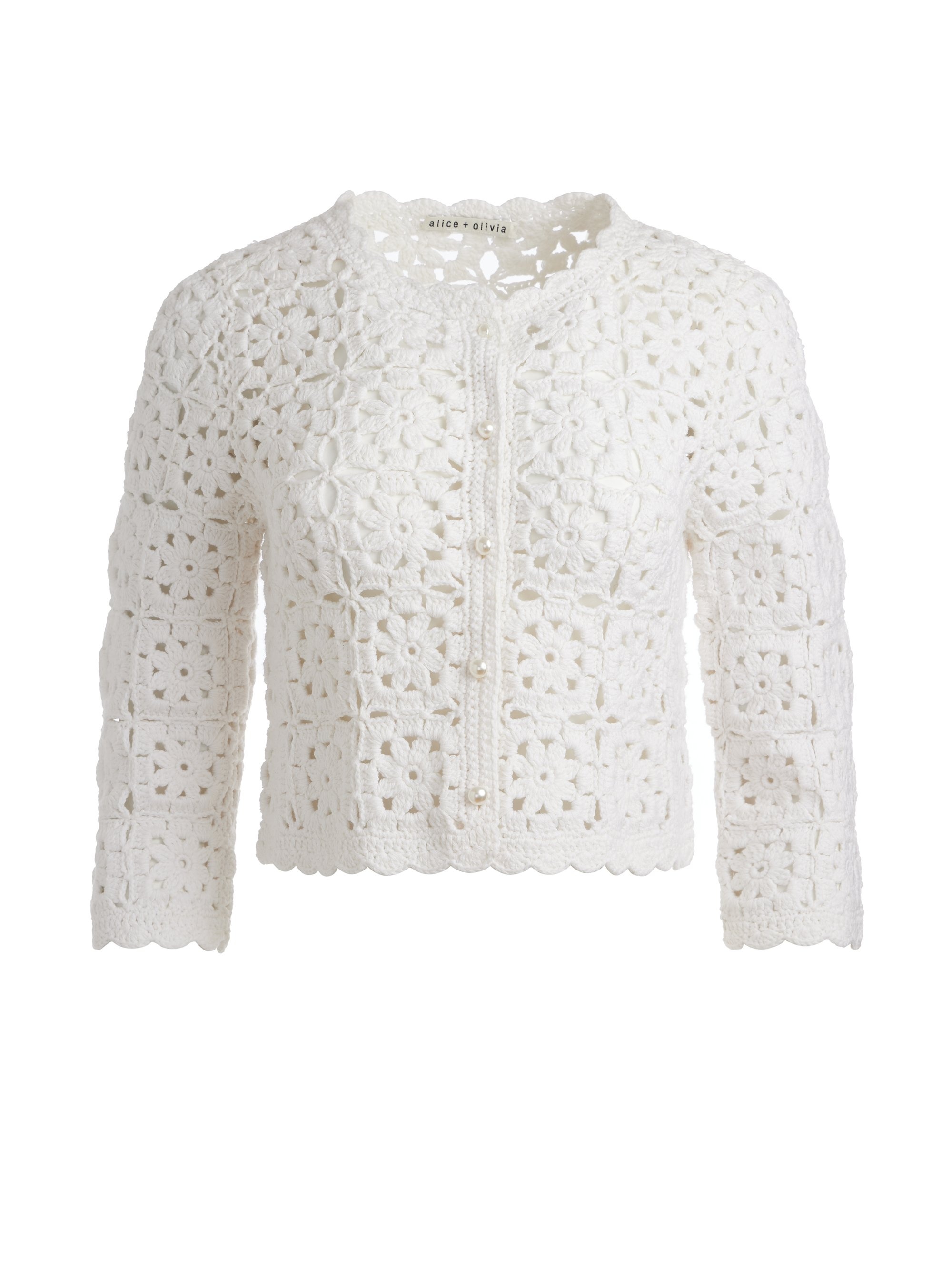 This playful cardigan is more than just a cute layer, it lends so much personality to your look. We adore the vintage vibes and the slightly cropped construction. DETAILS - Crocheted cardigan - Cropped fit - Crew neck - Embellished pearl buttons - Scalloped trim - 3/4 length sleeves - 60% cotton, 40% acrylic - Dry clean only - Imported FIT - Model is wearing a size Small and her measurements are 5’10”, 32” bust, 23” waist, 34” hips - Length from the shoulder: 18 1/2" - Fits true to size, take your normal size