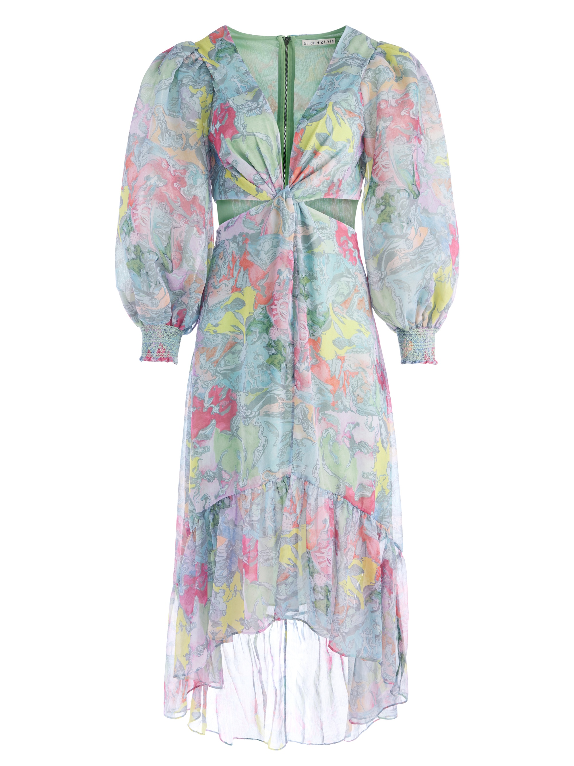 alice + olivia X Lola Schnabel, “Lola’s Dream,” the third summer capsule collection with friend of the brand and artist Lola Schnabel. Lola’s whimsical and ethereal style has always paired nicely with the alice + olivia aesthetic. The inspiration for the artwork printed on the tiles comes from the Roman Goddess Vesta, the goddess of the hearth, home, and family and Stacey’s own three daughters. PRODUCT DETAILS - Maxi length - Shorter in front - Deep V-neck - Twist front - Side cut outs - Puff sleeves - Back zipper closure - Total length to shortest point: 44 1/2” - Total length to longest point: 55 1/2” - 59% viscose, 41% silk - Fits true to size, take your normal size - Aqua is wearing a size 2 and her measurements are 5’10”, 32” bust, 23” waist, 34” hips - Dry clean only - Imported