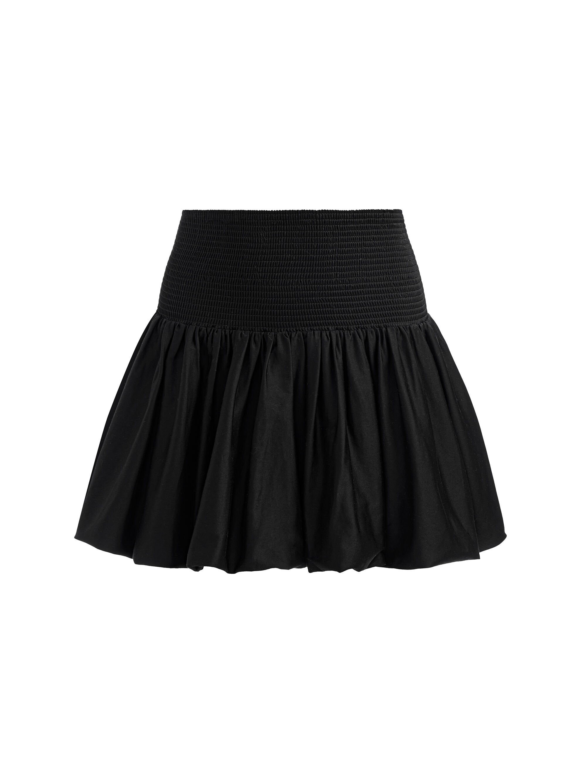 With a subtle drop waist and playful hem, our Arden black mini bubble skirt is the perfect blend of structure and ease. The pleats create movement and feminine volumes, while the smocked waistband maintains definition. Feminine, fun, and effortlessly chic-our Arden is made for twirling. DETAILS - Mini skirt - Bubble hem - Pleated cotton poplin - Drop waist - Smocked waistband - Back zipper closure - 97% cotton, 3% elastane - Dry clean only - Imported FIT - Model is 5'10" and wearing a size 0 - Skirt length: 10 1/4" - Fits true to size, take your normal size