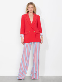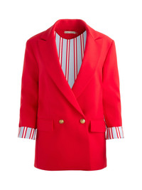 Polished yet effortlessly cool, our Arias red oversized blazer is a power piece with a modern edge. Its sharp tailoring and relaxed fit strike the perfect balance between structure and ease, while the bold hue makes a confident statement. Gold-tone buttons add a touch of refinement, while its inner striped lining brings an unexpected twist when you cuff the sleeves. Throw it over anything-from denim to dresses-for instant sophistication. DETAILS - Oversized blazer - Striped lining - Front flap pockets - Double breasted - Strong shoulders - 77% polyester, 17% viscose, 6% elastane - Dry clean only - Imported FIT - Model is 5'10" and wearing a size 2 - Length from the shoulder: 30" - Meant to be worn oversized, size down for a slimmer fit
