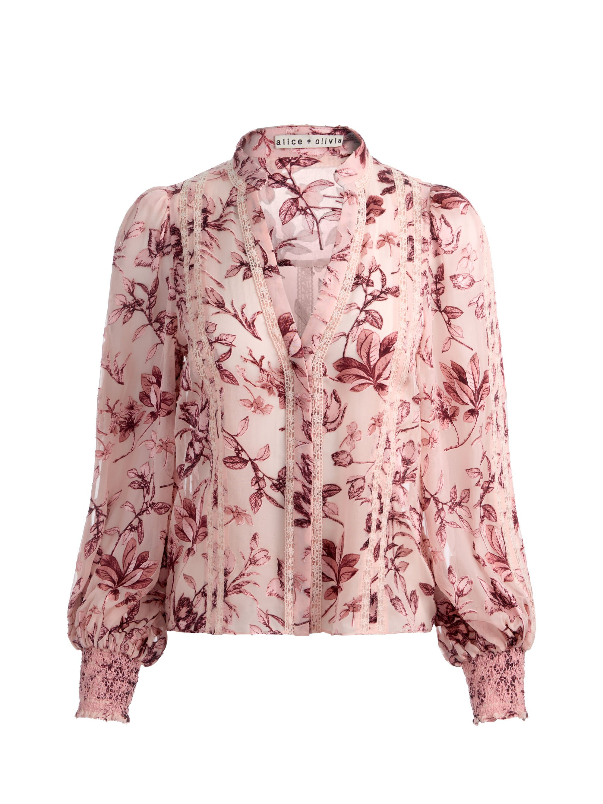 This romantic balloon sleeve top is crafted from silk satin burnout with a soft rose print that feels delicate yet elevated. The sleeves add volume and ease, while the collared neckline and hidden placket keep the look polished. Embroidered lace details add a feminine softness throughout. Tuck it into tailored trousers or wear it loose with denim for effortless polish. DETAILS - Floral printed blouse - Silk satin burnout - Semi sheer - Blouson sleeves - Button front with hidden placket - Embroidered lace - 61% viscose, 39% silk - Dry clean only - Imported FIT - Model is 5'10" and wearing a size XS - Length from the shoulder: 23" - Fits true to size, take your normal size