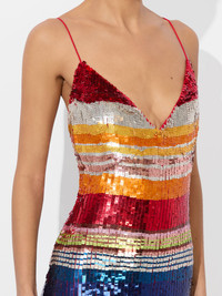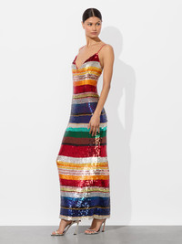 Sequins, but make them stripes. This floorsweeping rainbow maxi dress is covered in multicolored square sequins that shimmer with every step. With a plunging V-neckline, open back, and body-hugging silhouette, it’s a full glam moment without feeling overdone. Bring her to your next party and prepare to dazzle. DETAILS - Maxi dress - Hand-embellished square sequins - V-neck - Back slit - Mesh lining - Open back with zipper closure - 91% nylon, 9% elastane - Dry clean only - Imported FIT - Model is 5'10" and wearing a size 0 - Length from the shoulder: 59" - Fits true to size, take your normal size