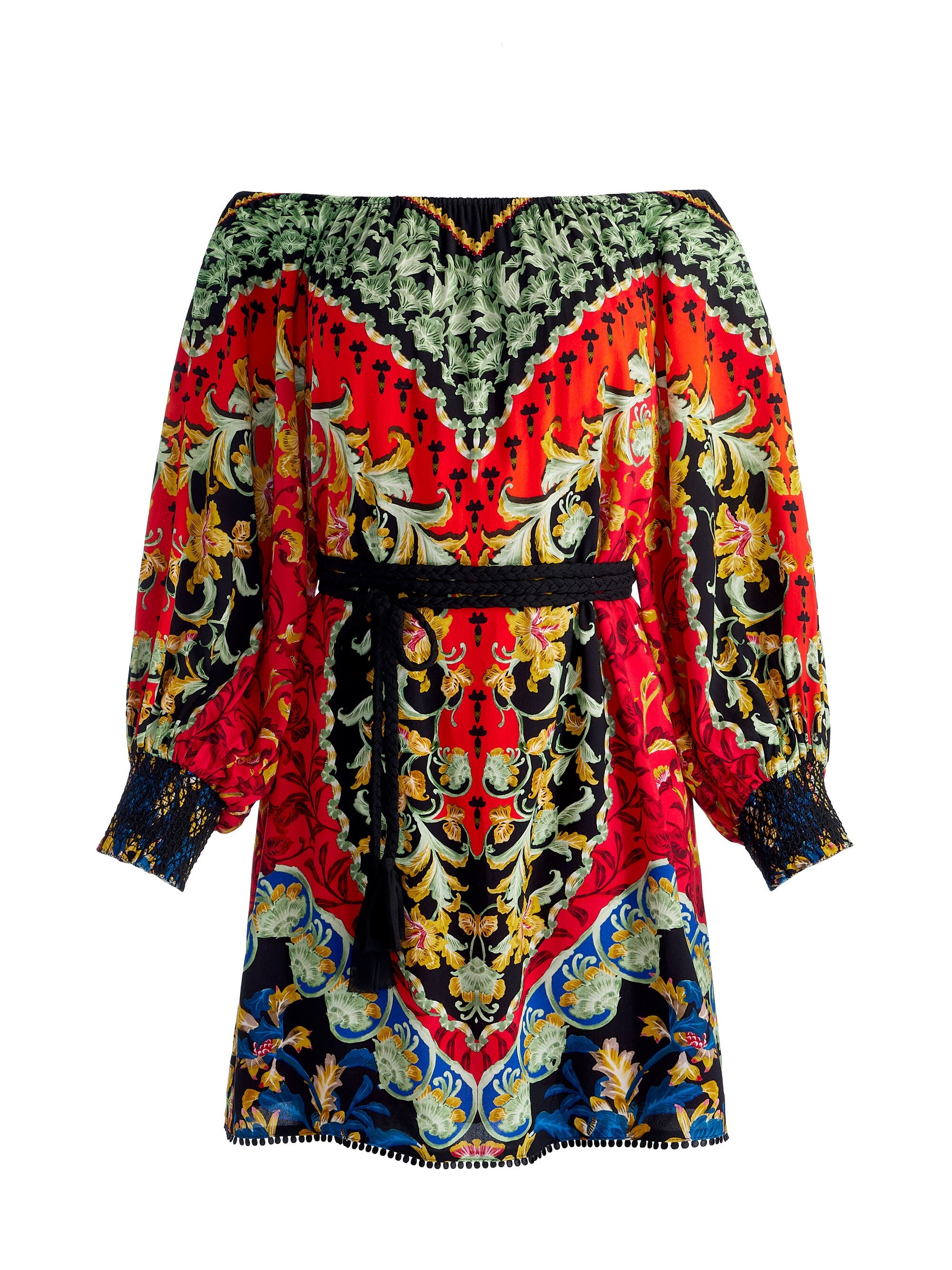 This off-the-shoulder printed mini dress is such an easy way to show off a bit of decolletage while keeping things modest. It's both flowy and romantic, thanks to those dramatic blouson sleeves and alluring florals. The super lightweight viscose also makes it a breathable and comfy piece to keep you cool even on those warm spring days. DETAILS - Mini dress - Off the shoulder - Blouson sleeves - Digitally engineered print on viscose - Embroidered hem - Adjustable braided tie waist - 100% viscose - Dry clean only - Imported FIT - Model is 5'10" and wearing a size XS - Length from the shoulder: 34" - Fits true to size, take your normal size