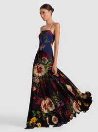 This body-hugging floral print maxi dress feels like it was made for romantic evenings. Cut from a soft, viscose jersey in a delicate magic garden gradient, it features delicate spaghetti straps, a pleated skirt for movement, and a second-skin fit that flatters every curve. The kind of dress that turns heads and fits effortlessly in your suitcase. Equal parts sultry and laid-back. DETAILS - Maxi dress - Bodycon fit - Printed viscose - Sleeveless - Pleated skirt - Inner non-slip silicone grip - Back zipper closure - 96% viscose, 3% elastane - Dry clean only - Imported FIT - Model is 5'10" and wearing a size 0 - Length from the shoulder: 60" - Fits true to size, take your normal size