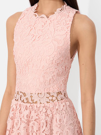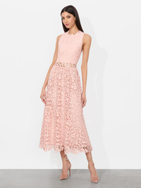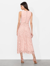 Chic and sophisticated, this matte lace dress offers a fresh take on modern romanticism. Its intricate floral lace overlay adds texture and dimension, while the fitted bodice with a high neckline provides a structured yet feminine silhouette. With a lined skirt and bandeau lining in the bodice, the delicate cutouts are always discreet. Its A-line skirt falls to a flattering midi length, making this dress perfect for both formal occasions and stylish daytime events. DETAILS - Midi dress - Matte lace - Bandeau lining - A-line fit - Lined skirt - Back zipper closure - 100% polyester - Dry clean only - Imported FIT - Model is 5'10" and wearing a size 0 - Length from the shoulder: 52 1/2" - Fits true to size, take your normal size