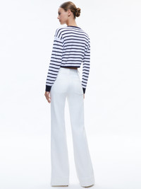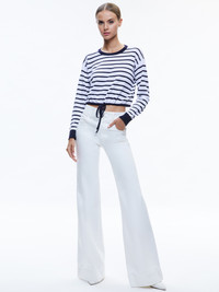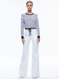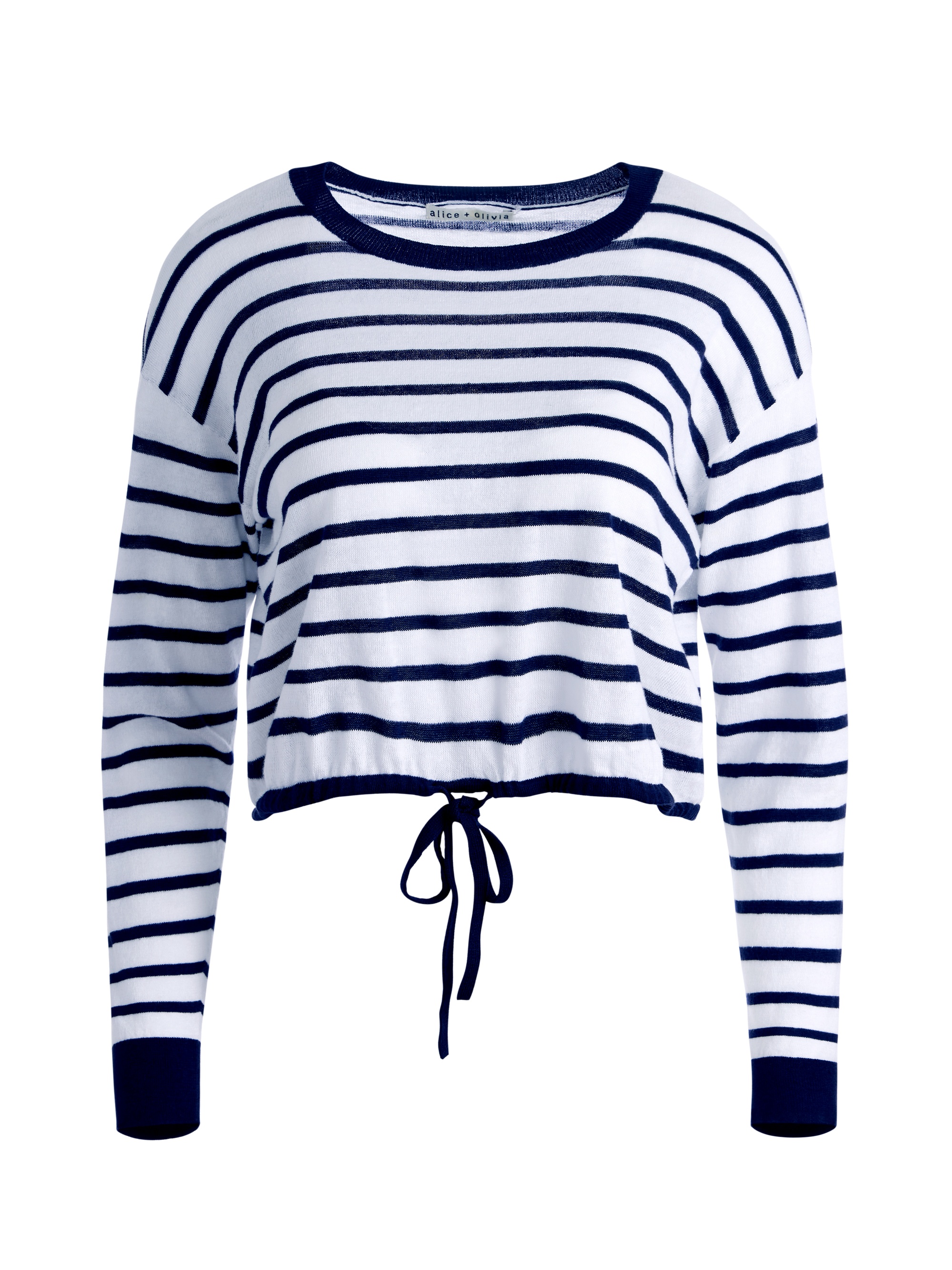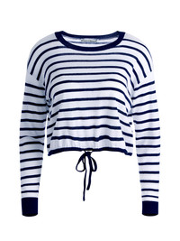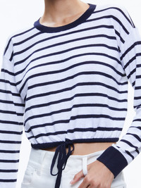 A not-basic basic, this drawstring pullover is a cute way to switch up your sweatshirt game. We love the classic navy and white stripe, the cropped length and cinched waist. DETAILS - Long sleeves - Crew neck - Cropped - Striped - Cinched tie bottom - 56% linen, 43% cotton, 1% nylon - Dry clean only - Imported FIT - Model is wearing a size Small and her measurements are 5'10", 32" bust, 23" waist, 34" hip - Total length: 17 1/2" - Fits true to size, take your normal size
