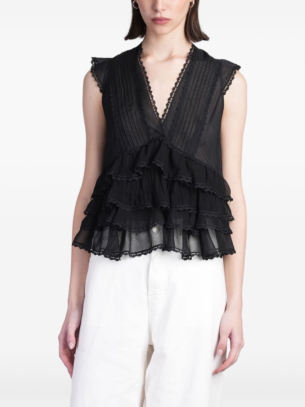 ruffle-detailing blouse Highlights - Black - V-neck - Sleeveless - Flared hem Imported Composition Cotton 70%, Silk 30%